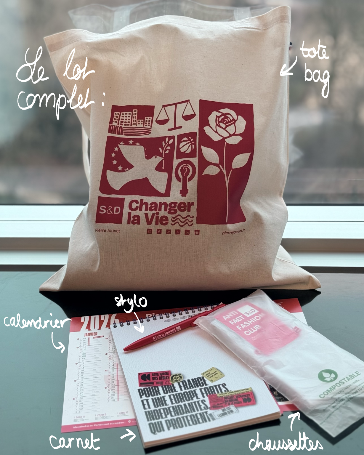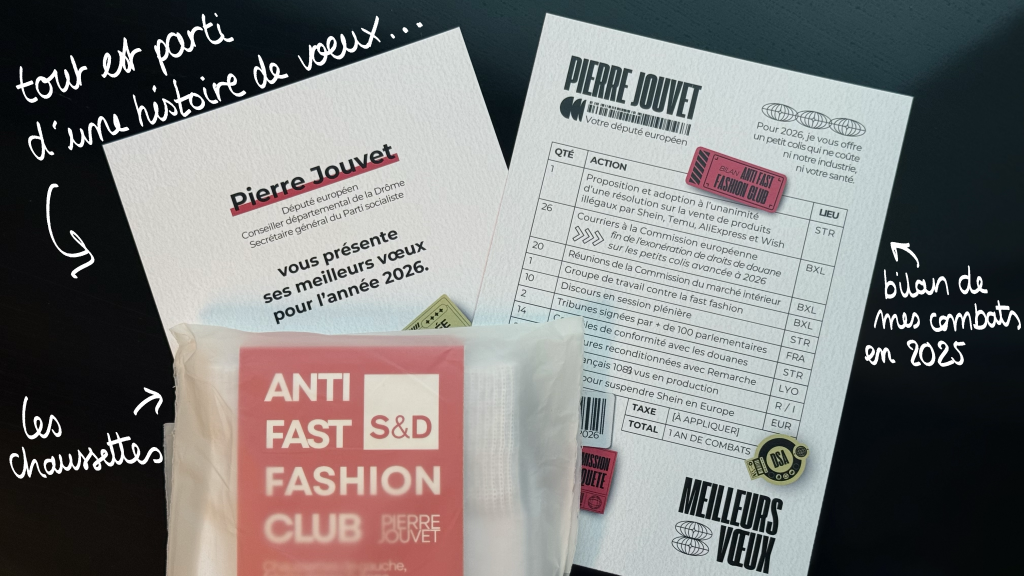 J’ai donc envoyé des chaussettes fabriquées en Europe, estampillées “Gauche / Gauche aussi”, en guise de carte de vœux. Elles étaient accompagnées d’une carte au format d’un bon de commande, résumant mes actions menées en 2025 pour défendre un contre-modèle textile européen, responsable et respectueux.