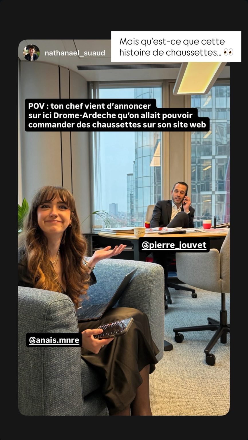 Quelques messages, deux ou trois coups de fil, et me voilà, en pleine réunion d’équipe, promettant au téléphone avec Ici Drôme Ardèche (à la stupeur générale, comme en témoigne la story ci-contre) de proposer ces chaussettes sur mon site.